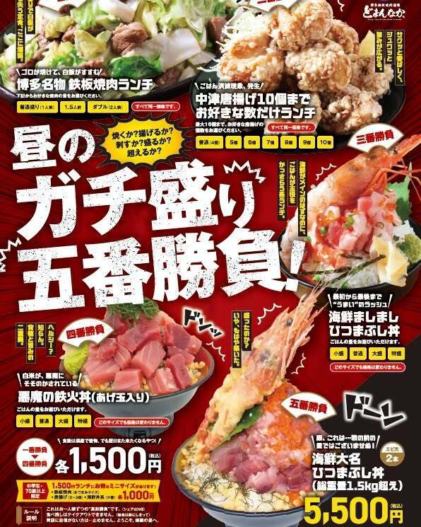 ガチ盛り三番勝負!海鮮ひつまぶし丼や博多鉄板焼肉・中津唐揚げランチなど、お昼からしっかり満足🍚✨ガチ盛りだけじゃなく ミニサイズもご用意