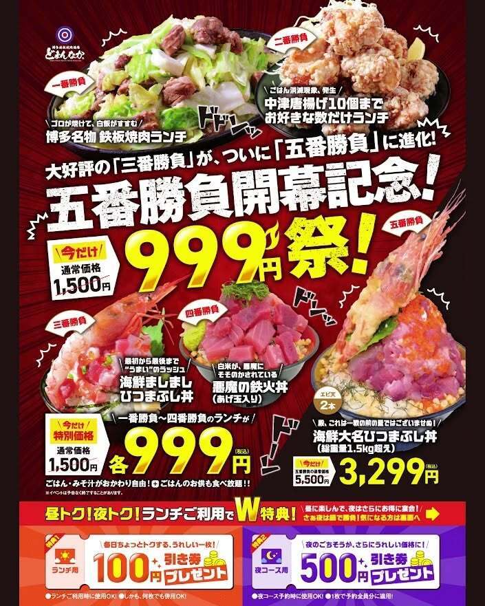 ガチ盛り三番勝負!海鮮ひつまぶし丼や博多鉄板焼肉・中津唐揚げランチなど、お昼からしっかり満足🍚✨ガチ盛りだけじゃなく ミニサイズもご用意